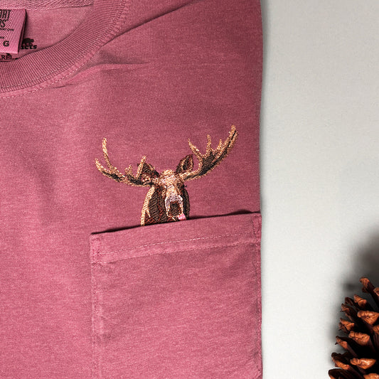 Embroidered Moose Cotton Pocket Tee - Unisex- Woodland Animals
