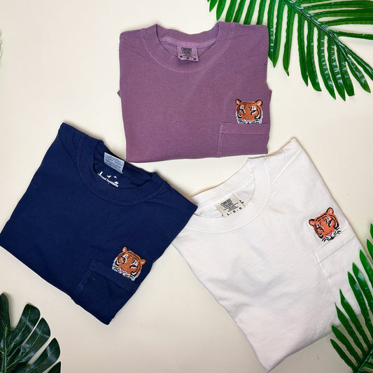 Embroidered Tiger Pocket Tee – Unisex Cotton Wildlife Shirt