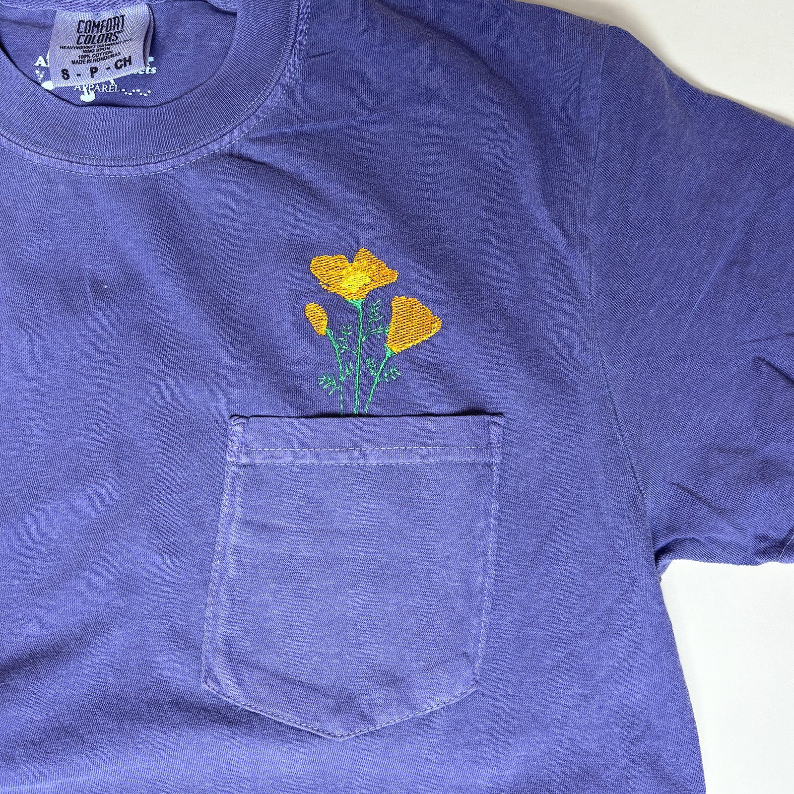 Unisex Embroidered California Poppy Pocket Tee in Comfort Colors