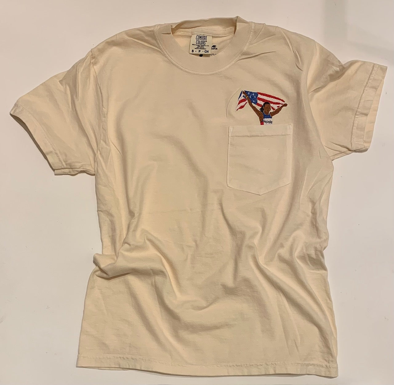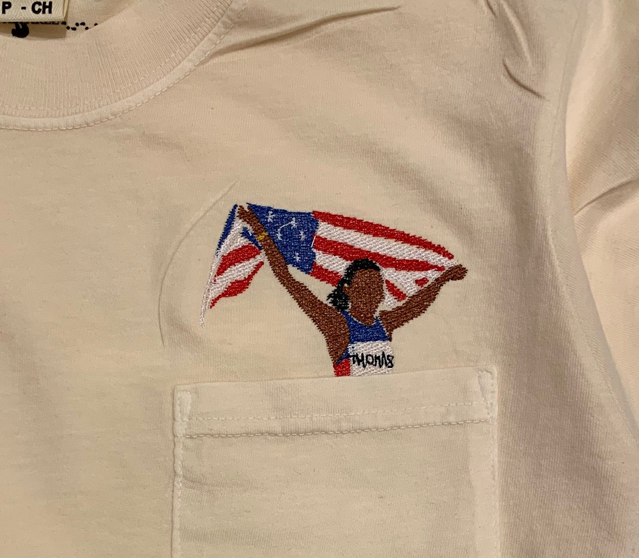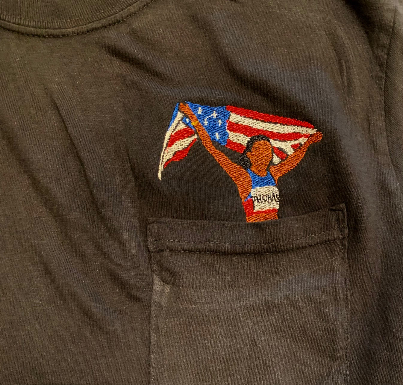 These 100% cotton embroidered Gabby Thomas pocket tees are all you need for comfort with a touch of artistic pop. I hand drew the olympic gold medalist and these are embroidered right in the back of the shop. I have been on the search for the perfect cotton pocket tees for this design and found them. These shirts are incredible fit and the sustainably USA grown cotton feel makes these your new favorite shirt.