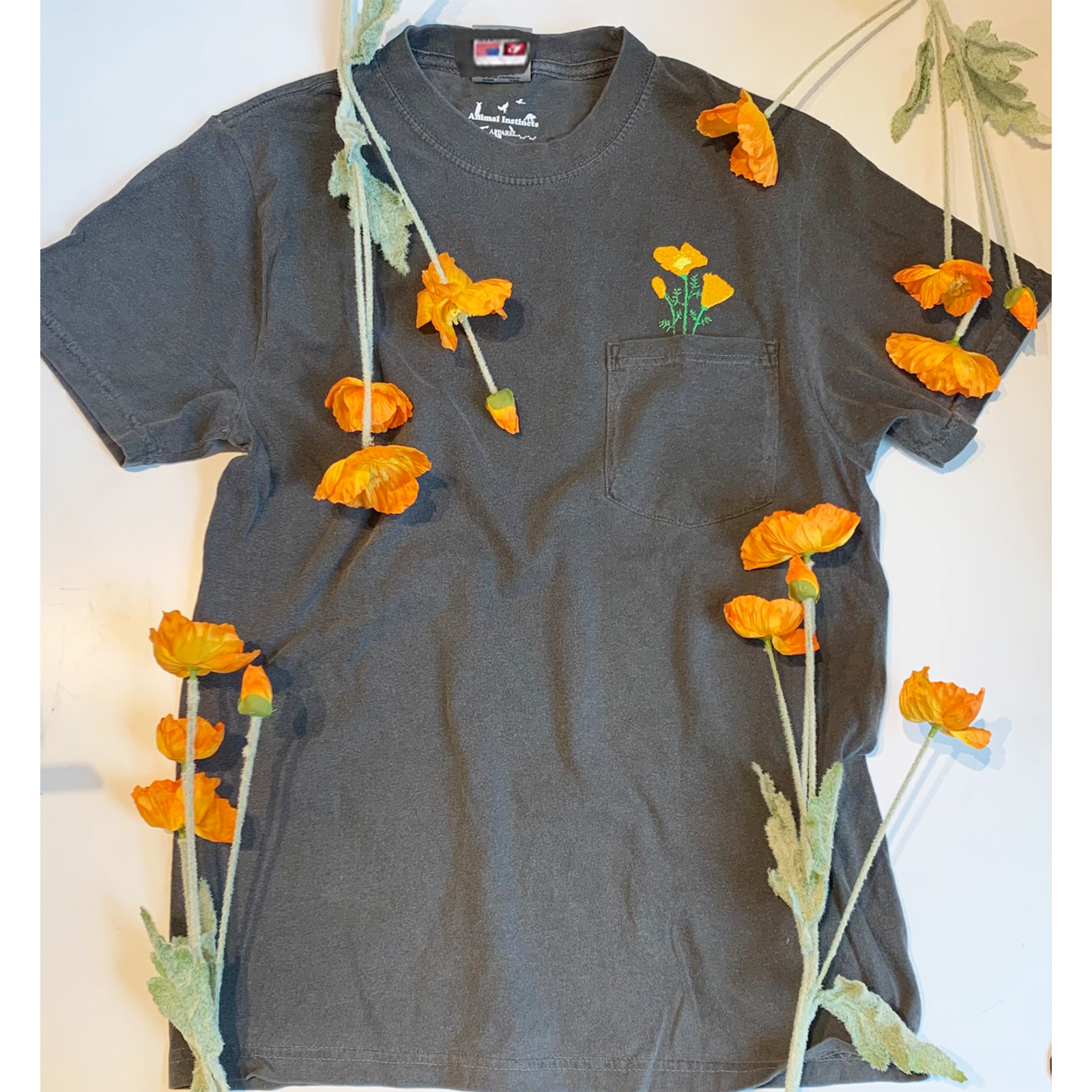 California Poppies Embroidered on a heavyweight USA Made cotton pocket tee. This style is more slim fit and structured than our usual Comfort Colors style. It holds up incredibly well and can feel like a new shirt for years.